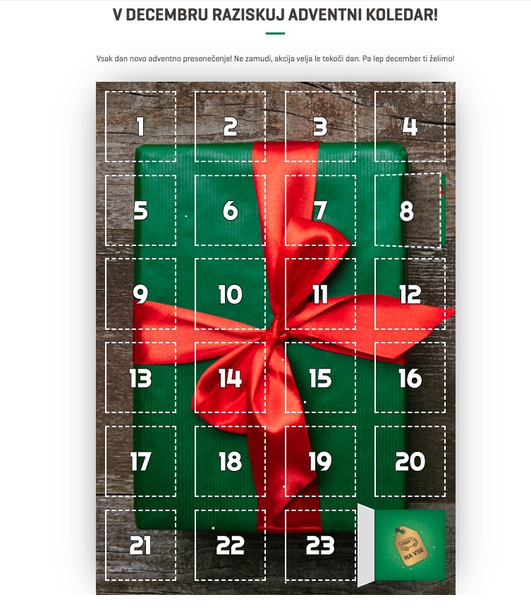 PRAKSA: Lep primer adventnega koledarja je spletna trgovina runda-sekunda, kjer so z adventnim koledarjem dnevno nagovarjali svoje uporabnike. Uporabniki so tako lahko vsak dan odkrili novo polje, na katerem so se skrivale različne ugodnosti in akcije.