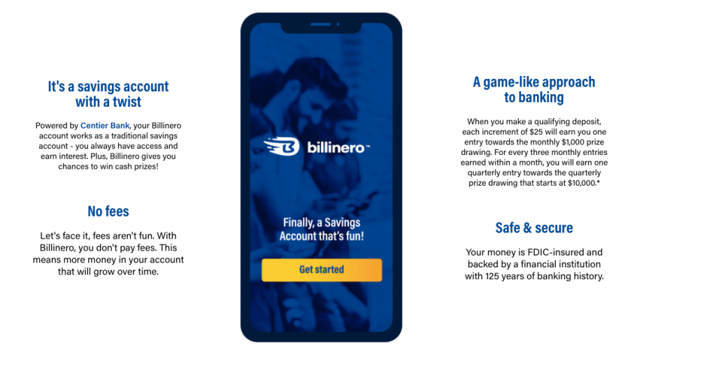 Ameriška Banka Centier je – potem, ko je bilo vodstvo osuplo nad statistiko, da dva od treh prebivalcev nimata niti 400 dolarjev prihrankov – svojim strankam ponudila igro Billinero. S sloganom: »Kot bančništvo, le da zabavno!« Aplikacija temelji na varčevalnem računu, vsak polog nanj v višini najmanj 25 zelencev pa uporabniku prinese cekin. Mesečno največ 12. Vsak cekin pomeni možnost udeležbe v rednem mesečnem žrebanju, na katerem banka podeli tisočaka nagrade. Potem so tu še četrtletna žrebanja z višjo nagrado, v katerih lahko sodeluješ z najmanj tremi cekini oz. Billineri. Igra je doživela tolikšen uspeh, da se jo je banka letos odločila nadgraditi s še dodatnimi možnostmi.