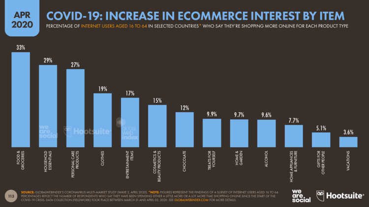 Po raziskavi, ki jo je aprila opravil GlobalWebIndex, naj bi več kot polovico spletnih uporabnikov več časa namenilo tudi spletnemu nakupovanju. Zaradi karantene se je zanimanje za artikle na spletu najbolj povišalo na prehrambenem področju, področju nujnih gospodinjskih pripomočkov in osebne higiene.