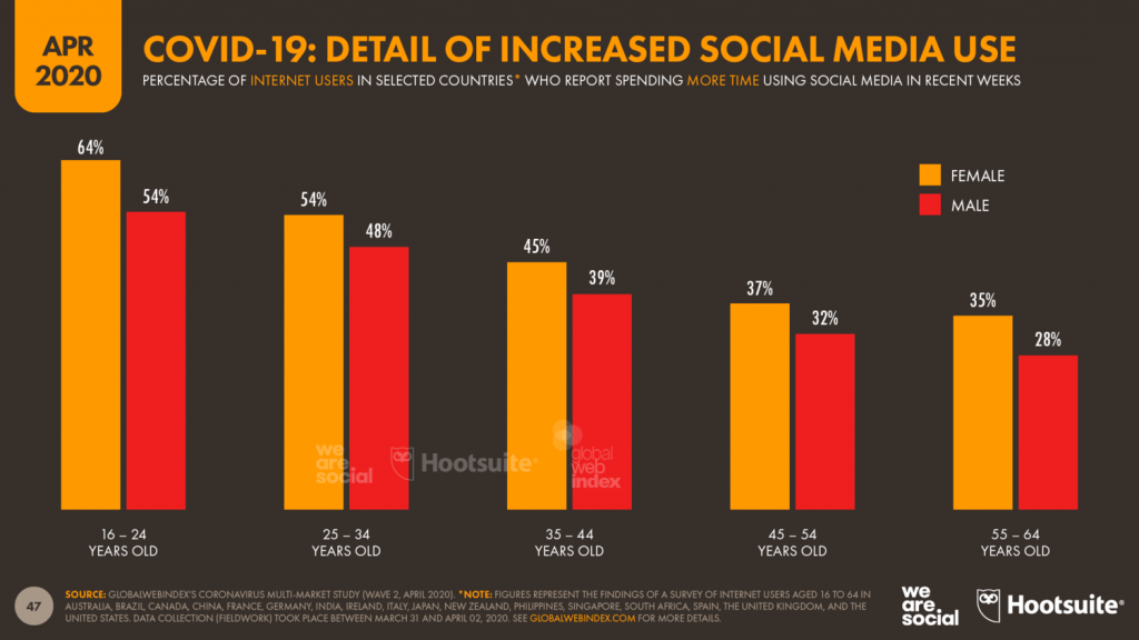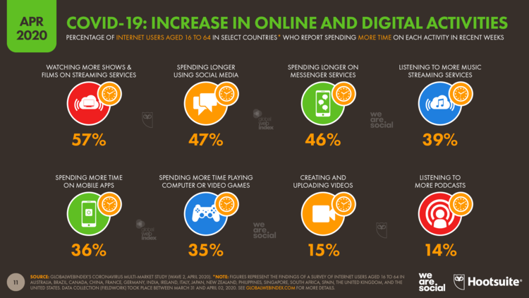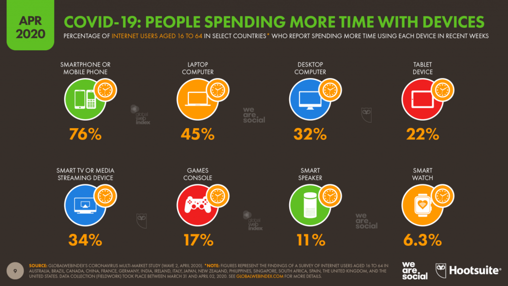 Raziskava (GlobalWebIndex) je hkrati tudi pokazatelj sprememb načina uporabe digitalnih naprav. 46% ljudi pravi, da več časa preživi na telefonih, 47% na družabnih omrežjih, 36% je povečalo uporabo mobilnih aplikacij.