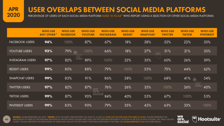Samo 1% uporabnikov TikToka ne uporablja nobenega drugega omrežja, kar pomeni, da je mogoče skoraj čisto vse njegove uporabnike doseči tudi na drugih kanalih.