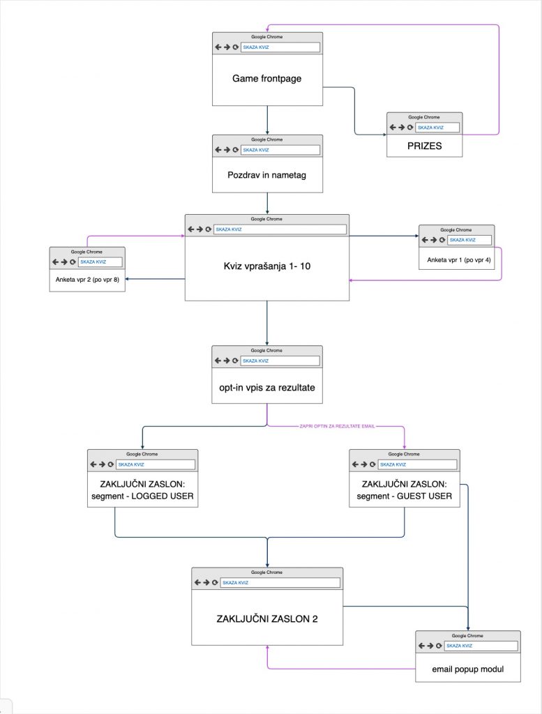 Spodnji potek uporabnika prikazuje na kakšen način smo za naročnika ustvarili načrt poteka uporabnika in vzvodov kviza. Kviz je sicer hibrid prodajnega in izobraževalnega kviza. Uporabnike smo izzvali s konkretnim vprašanjem ali menijo, da imajo dovolj znanja o panogi, ki je za njih zanimiva. Kviz uporabnika sooči z 10 vprašanji, med igranjem pa poskrbi tudi za nekaj implicitnih igrifikacijskih prijemov, katerih namen je prehod v spletno trgovino po odigranem kvizu. Poleg tega uporabniku postrežemo še z anketo, katerih odgovori naročniku pomagajo bolje razumeti in poznati svoje uporabnike.