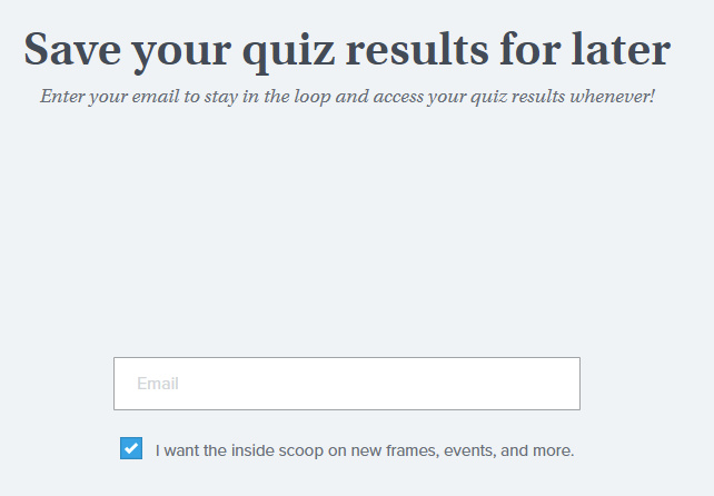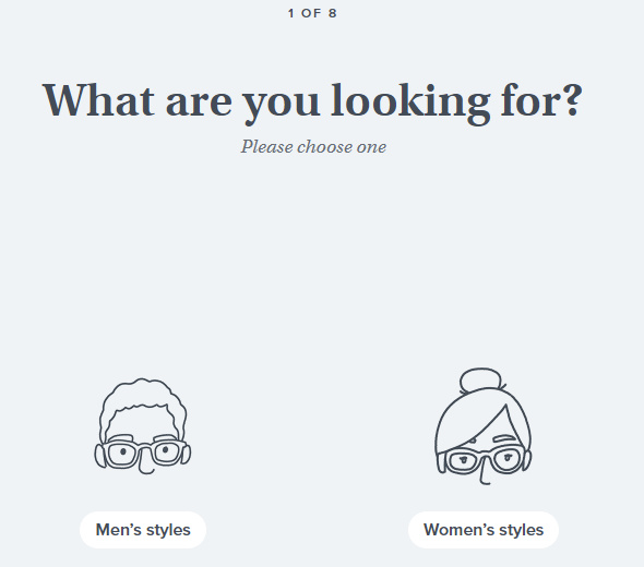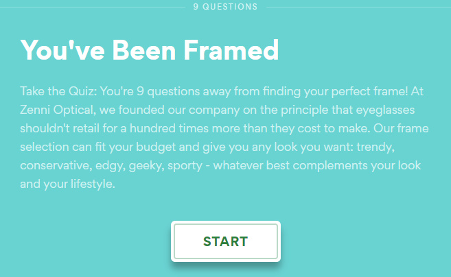 Segmentacijski kviz podjetja Warby Parker na preprost način omogoča izbiro petih okvirjev za očala, ki jih uporabniku brez stroškov pošljejo na dom, da jih lahko preizkusi.