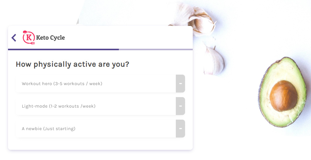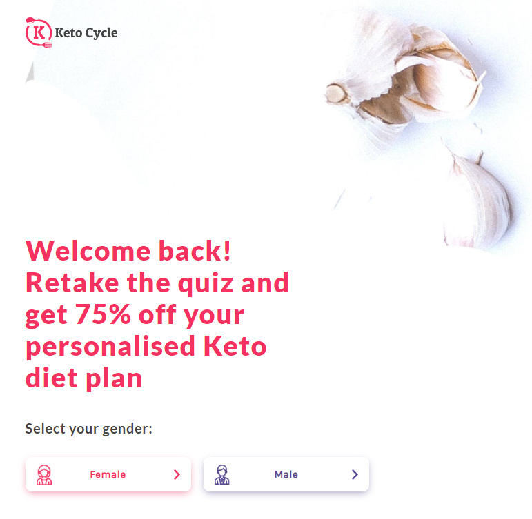 Ta segmentacijski kviz je priljubljen pri tistih ljudeh, ki se sprašujejo ali jim lahko Keto shujševalna kura pomaga izgubiti odvečne kilograme. Kviz se začne z vprašanje o spolu uporabnika, saj ima to pomemben vpliv pri nasvetih v nadaljevanju kviza.