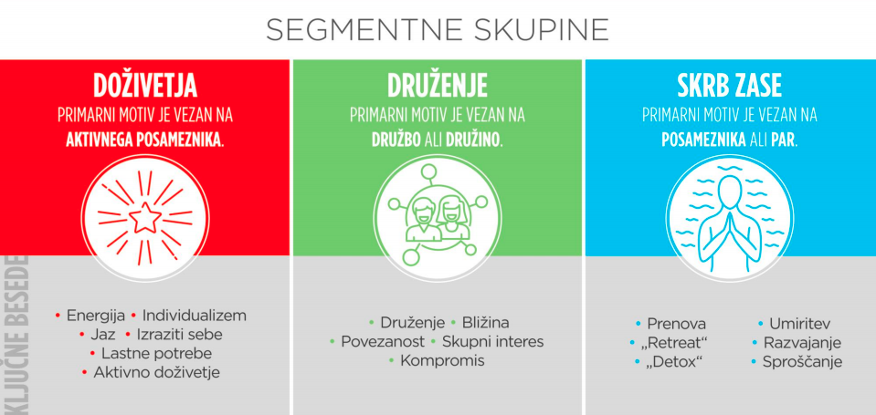 Ključne persone so glede na motive potovanja razdeljeni v tri segmentne skupine (vir).